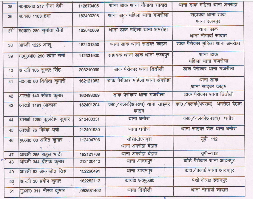 जिनमें सुशील कुमार सीसीटीएनएस थाना अमरोहा नगर को सीसीटीएनएस थाना नौगांव सादात, पूनम कुशवाह सीसीटीएनएस थाना नौगांवा सादात को सीसीटीएनएस थाना अमरोहा नगर ,कुमारी प्राची को सीसीटीएनएस थाना नौगांवा सादात से सीसीटीएनएस थाना अमरोहा देहात, मनु पांचाल सीसीटीएनएस थाना अमरोहा देहात से सीसीटीएनएस महिला थाना अमरोहा, जितेश को सीसीटीएनएस महिला थाना अमरोहा से सीसीटीएनएस थाना सैद नागली, चंचल मलिक को सीसीटीएनएस थाना बछरायूं से सीसीटीएनएस थाना नौगांवा सादात ,गीता को सीसीटीएनएस थाना गजरौला से सीसीटीएनएस थाना हसनपुर, गीता चौधरी को सीसीटीएनएस थाना हसनपुर से सीसीटीएनएस थाना गजरौला ,जुगली चौधरी को सीसीटीएनएस थाना सैद नगली से सीसीटीएनएस थाना आदमपुर, विनय कुमार को सीसीटीएनएस थाना आदमपुर से सीसीटीएनएस थाना एएचटी, नितिन कौशिक को कोर्ट पैरोंकार थाना रजबपुर से कोर्ट पैरोंकार थाना अमरोहा नगर, रविता चौधरी को कोर्ट पैरोंकार थाना रजबपुर से कोर्ट पैरोंकार थाना अमरोहा नगर ,सत्य प्रकाश को कोर्ट पैरोंकार थाना अमरोहा देहात से कोर्ट पैरोकार महिला थाना गजरौला, शिवम कुमार को कोर्ट पैरोकार थाना अमरोहा देहात से कोर्ट पैरोंकार थाना धनोरा ,चंद्रशेखर को कोर्ट पैरोकार थाना धनोरा से कोर्ट पैरोंकार थाना बछरायूं, सावन कुमार को कोर्ट पैरोंकार थाना धनोरा से कोर्ट पैरोंकार थाना हसनपुर, राजवीर सिंह को कोर्ट पैरोंकार थाना बछरायूं से कोर्ट पैरोंकार थाना रहरा, रोहित कुमार को कोर्ट पैरोकार थाना बछरायूं से कोर्ट पैरोकार थाना धनोरा, अमित कुमार को कोर्ट पैरोकार थाना हसनपुर से कोर्ट पैरोकारथाना में रहरा, प्रदीप कुमार को कोर्ट पैरोकार थाना रहरा से कोर्ट पैरोकार थाना बछरायूं ,नितिन कुमार को कोर्ट पैरोकार थाना रहरा से कोर्ट पैरोकार थाना आदमपुर को स्थानांतरित किया गया है।